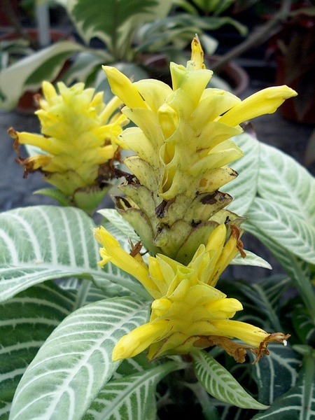 - trubkovité květy, 2,5-3 cm délky, žluté až žlutooranžové barvy; výrazné podpůrné listeny stejné barvy s červeným tónováním, na rostlině vytrvávají déle než trubkovité květy