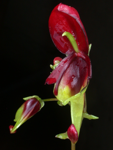 oboupohlavné, souměrné, pětičetné s masívní vakovitou červenozelenou (někdy růžově purpurovou) ostruhou a drobnými žlutými petaly