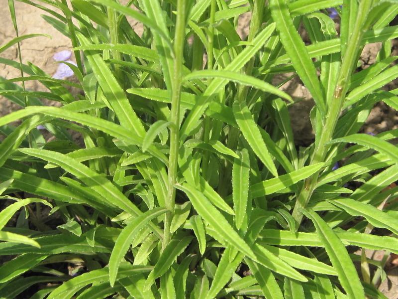 - tuhé, lysé a lesklé, čepel přízemních listů ve sterilní růžici obvejčitá až obkopinatá, lodyžní listy přisedlé a čárkovitě kopinaté, připomínající broskev, 7–12 cm x 0,5 - 1 cm s velmi jemně zoukatým okrajem čepele, Přízemní listy s malou krycí schopností