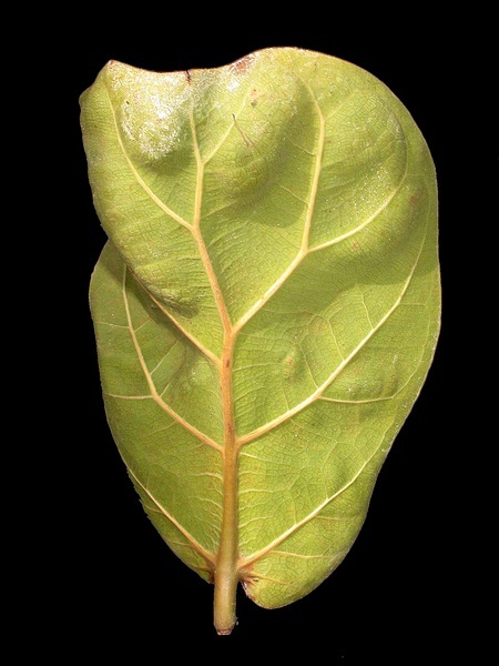 - lyrovité se srdčitou bází, až 0.5 m dlouhé, na vrcholu oblé nebo mělce vykrojené a zkráceně tupě hrotnaté, kožovitě tuhé a oboustranně lysé, vespod s hrubě vyniklou nervaturou, se silnými řapíky a zvlněnými okraji; palisty nápadné, hnědopurpurové, neopadavé