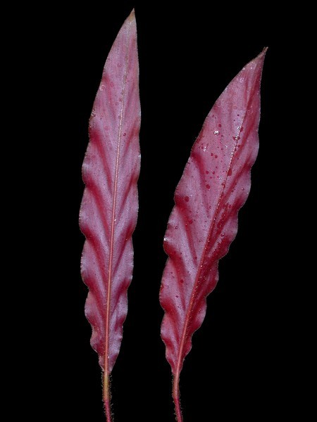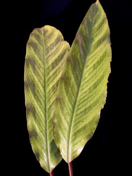 - homotropní, dlouze řapíkaté (poměr délky řapíku k čepeli proměnlivý v ontogenezi), hrotnaté, úzce kopinaté, zvlněné, asymetrické čepele až 0.3 m dlouhé, shora temně zelené, vespod purpurové, červenavě pýřité