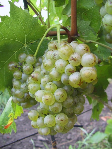 středně velký válcovitý hrozen, hustší, často s křidélkem, s delší stopkou; bobule kulatá malá až středně velká, žlutozelená; na vrcholu bobule je černá tečka po blizně