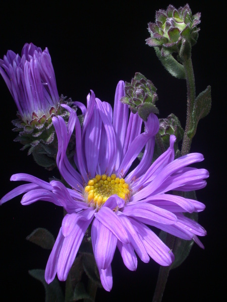 - pětičetné, různoobalné (kalich přeměněn v chmýr), srostloplátečné, paprsky souměrné, lineární, samičí, na půl palce dlouhé, modré až modropurpurové; kvítky v disku koleomorfní, oboupohlavné, žluté