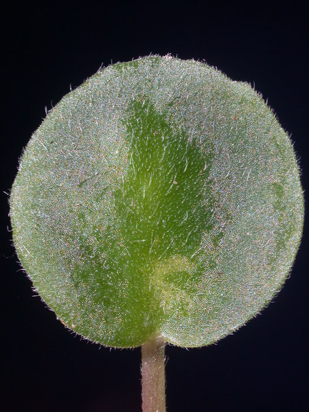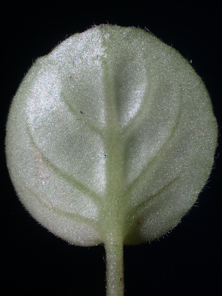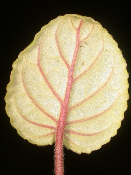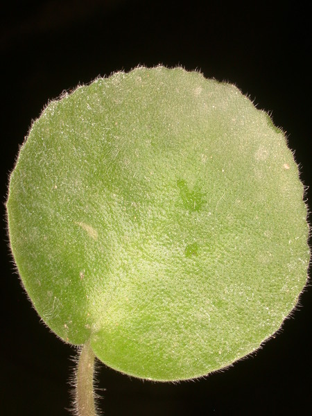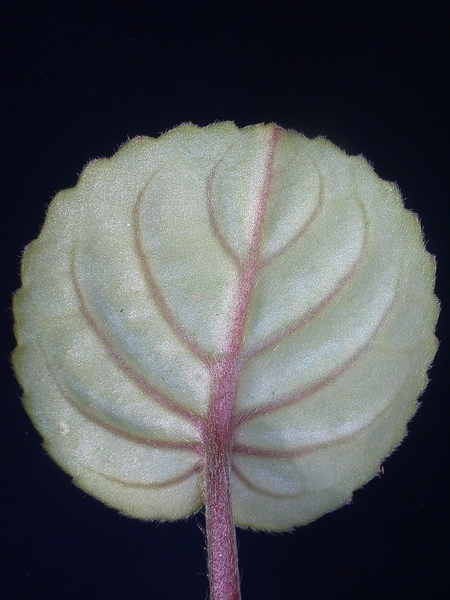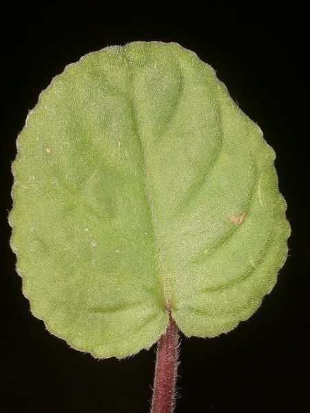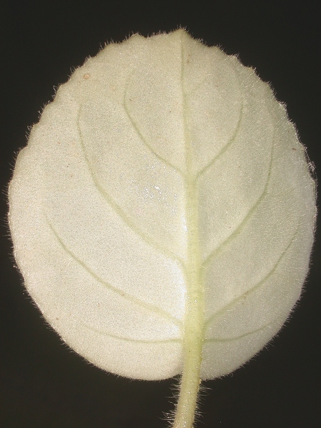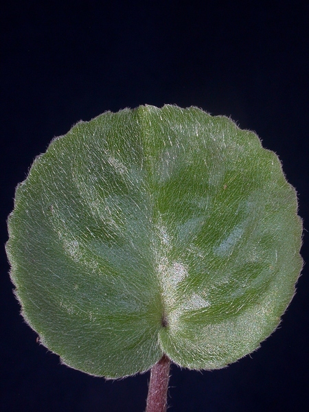 - dlouze řapíkaté, srdčitě okrouhlé, do 0.1 m dlouhé, masité a sametově oděné dlouhými a krátkými, přitisklými trichomy, shora svěže zelené, vespod bělavé, s vroubkovanými okraji