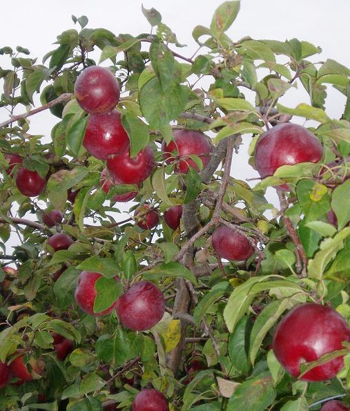 - středně velké až menší (90-120 g), málo vyrovnané, žluté s karmínově červeným líčkem se zřetelnými světlými tečkami a typickým fialovým ojíněním, šťavnaté, velmi aromatické, osvěžující