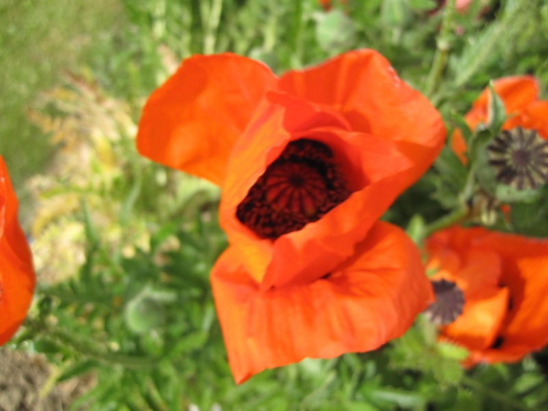 - Květní poupě vzpřímené. Květy jednotlivé, velké, v průměru cca 10 - 12 cm, ohnivě červené často s velkou černou bazální skvrnou a prstencem nápadných černých tyčinek, podepřené několika zelenými listeny.