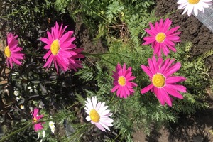 - jazykovité květy v odstínech růžová, fialová, vzácně i bílý, žluté trubkovité květy v terči