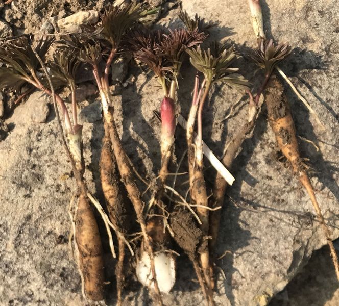 silné válcovité kořeny semenáčů Paeonia tenuifolia. Foto: T. Kuťková.