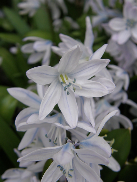 - Květenství jsou poměrně menší, bílé nebo s modrým nádechem s šedomodrým proužkem vně květních plátků. Vykvétá nejčastěji v dubnu. Květy se plně otevírají jen za slunného počasí. Po několika letech na jednom stanovišti vytváří husté, bohatě kvetoucí trsy.