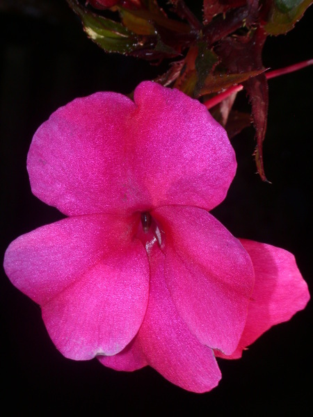 - oboupohlavné, souměrné, velikosti dětské dlaně s pěti rozměrnými, srdčitě vykrojenými, ploše seskládanými petaly a dlouhou tenkou ostruhou, v šarlatových, purpurových, růžových a bílých odstínech