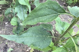 - přízemní listy řapíkaté, široce kopinaté, lodyžní střídavé, kopinaté s dlouhou protáhlou špičkou, ostře zubaté; sytě zelené, tuhé s výraznou žilnatinou