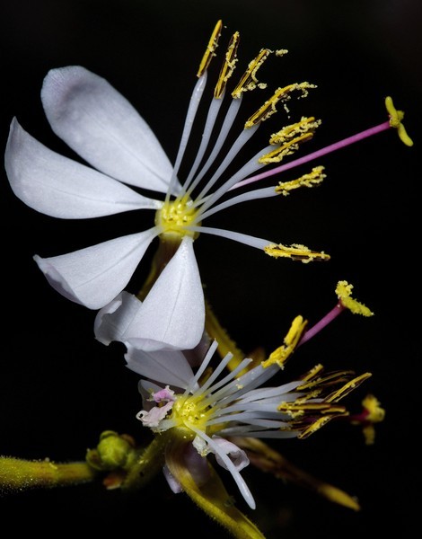 - početné, neveliké, zygomorfní, různoobalné, čtyřčetné, diplostemonní s čtyřlaločnými bliznami, bílé nebo růžové, často s červenými kalichy