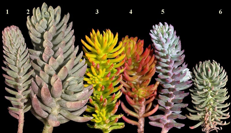 - Legenda ke grafické příloze 1 - Uher-Petrosedum.varia: 1. Petrosedum anopetalum; 2. Petrosedum sediforme; 3. Petrosedum rupestre ‘Angelina’; 4. Petrosedum rupestre; 5. Petrosedum montanum ‘Jenny’; 6. Petrosedum forsterianum ‘Elegans’